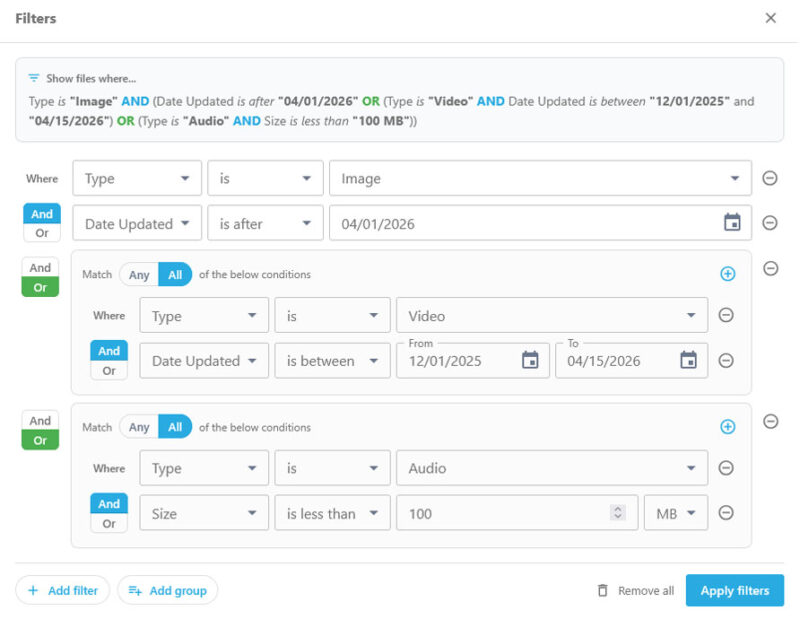 Group conditions for compound queries: “file name contains ‘invoice’ OR ‘receipt,’ AND type is PDF, AND updated after December 31, 2025.”